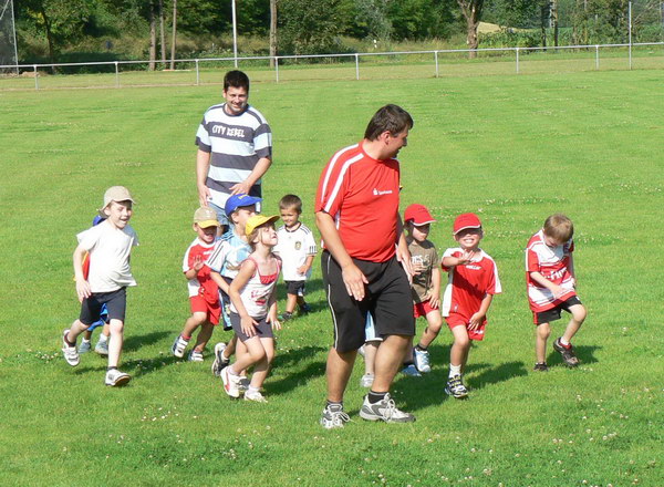 Nach dem Sommerferien soll mit dem Training begonnen werden. Das Bild zeigt die Kinder mit ihren Betreuern Thomas Mutschler (vorne) und Thomas Obergruber beim Warmlaufen.