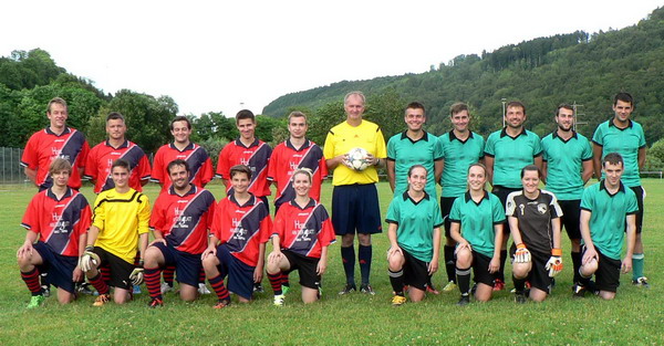 Das Bild zeigt die beiden Endspielteilnehmer vom Flecken (links) und dem Sommerbergzusammen mit Schiedsrichter Helmut Link. Mit dem 2:0 Sieg verteidigte der Flecken seinen Turniersieg vom Vorjahr erfolgreich.