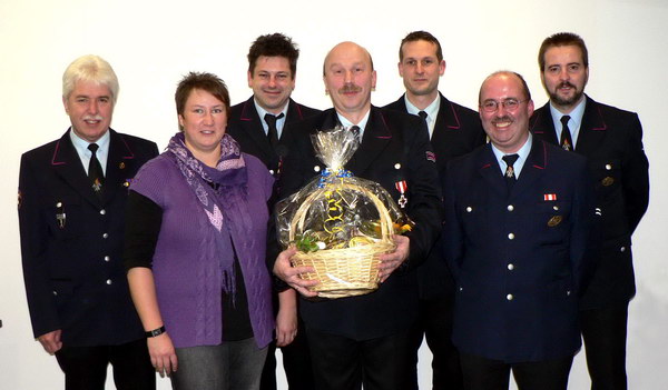 Wittig mit einem Weingeschenk. Einen Geschenkkorb hatte zudem Kommandant Ulrich Weigold im Namen der Wehr parat. Zusätzlich wurde Reiner Schrägle wie auch Thomas