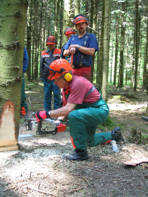 Am Samstag wurde in einem WaldstĂźck bei Fluorn die richtige Schneide- und Trenntechnik geĂźbt. Danach musste jeder Teilnehmer einen zugewiesenen Baum in der âHaltebandâ oder â2/3-Technikâ fällen.