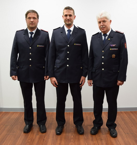 Das Bild zeigt (von links gesehen) den neuen stellvertretenden Abteilungs-Kommandant Oliver Schreiber, Abteilungs-Kommandant Martin Schaible und Stadtbrandmeister Eugen Heizmann.
