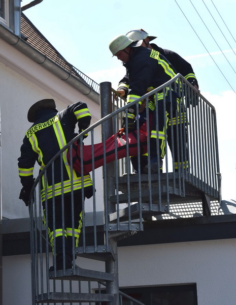 Wendeltreppe im Freien am Postweg musste eine vermisste Person geborgen werden. Nach einer kurzen Information für die Festbesucher über den Übungsablauf durch Jugendwart Reiner Schrägle wurde der