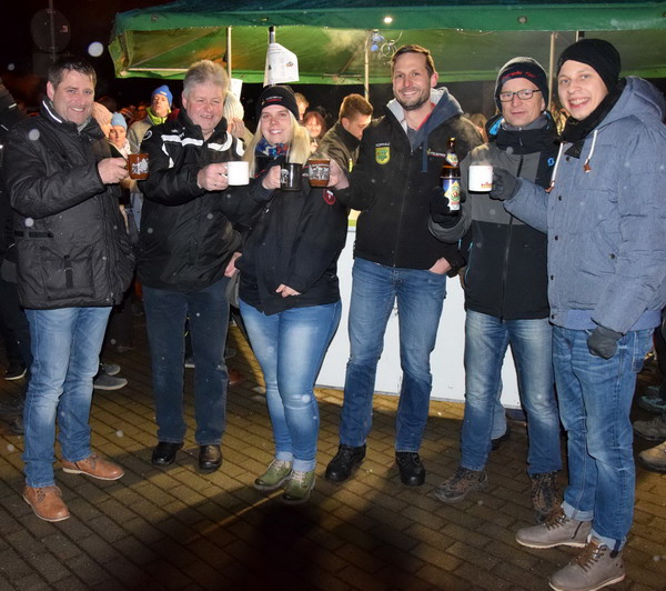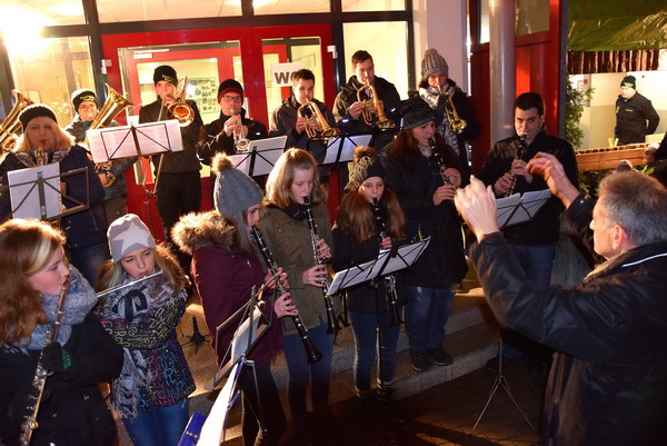 weihnachtliche Stimmung sorgten ein strahlender Weihnachtsbaum sowie die aufgestellten Feuerkörbe und einige Schneeflocken. Eine Abordnung vom Musikverein stimmte unter der Leitung von Lothar