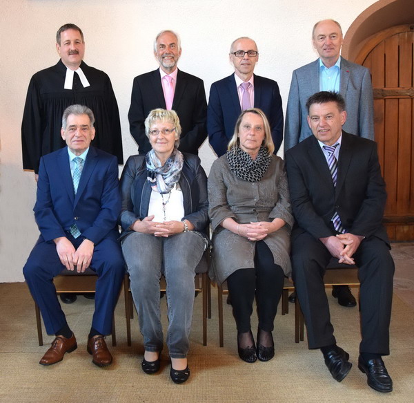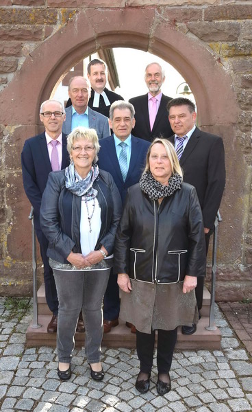 Das Bild am Torbogen zeigt (von links gesehen) Rolf Springmann, Rolf Mutschler, Gerlinde Schwenk (geb. Sturm), Pfarrer Wolfgang Müller, Lothar Grötzinger, Walter E. Ziegler, Betty Lambart-Augenstein und Roland Bühler.