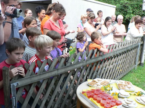 Vor dem Kindergarten warteten bereits die Eltern und Geschwister sowie Omas und Opas mit Foto- und Filmkameras auf ihre Sprösslinge. Zur Feier des