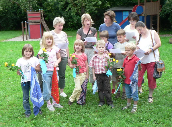 Traditionell wurden die kommenden Schulanfänger in einer kleinen Abschiedsfeier vor den Sommerferien aus dem Kindergarten „geworfen“. Die Erzieherinnen Sabine
