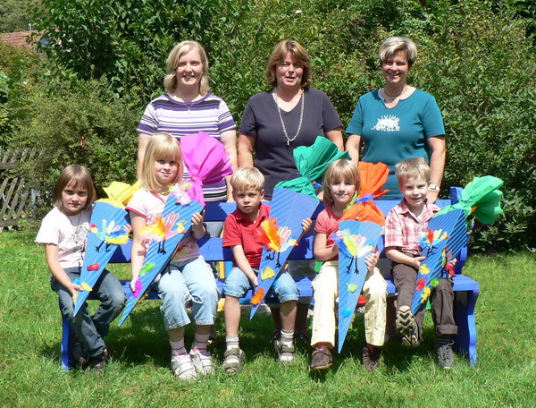 Das Bild oben zeigt (von links) Julia Schreiber, Annika Pfau, Adrian Sturm, Annalena Weigold und Lucas Janker mit ihren Schultüten. Dahinter (von links) die Erzieherinnen Iris Steinwand-Wörner, Angelika Raible und Sabine Springmann.