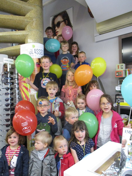 Die Kinderschar mit ihren Erzieherinnen dankt dem Optiker-Team für einen spannenden und interessant gestalteten Vormittag.