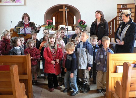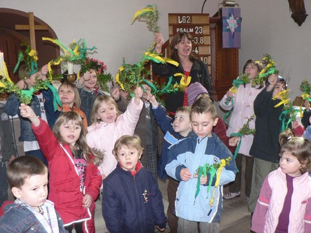 die Bedeutung des Palmsonntags. Musikalisch wurde der Gottesdienst vom Kindergarten umrahmt. Gemeinsam mit der Kirchengemeinde stimmten sie das Lied „Ein neuer Tag ist da“ an. Danach zogen sie sich zu einem