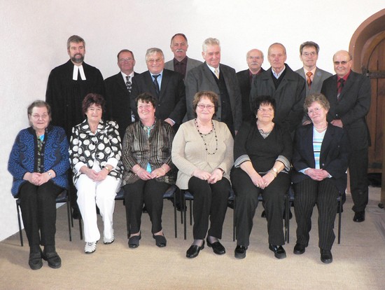 Das Bild zeigt (in der hinteren Reihe) von links nach rechts: Pfarrer Christoph Knoke, Peter Raeck, Dieter Lambart, Alfon Hetzel, Karl-Otto Kinzler, Willi Heinzelmann, Karl Steinwand, Arnold Vincon und Herbert Seeger. Vordere Reihe (von links nach rechts): Anita Schwarz, Ursula Rösch, Traude Seeger, Waltraud Pfau, Hannelore Mutschler und Hannelore Wößner.