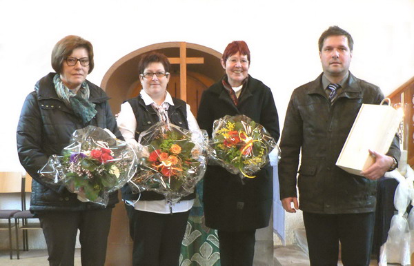 dem Laienvorsitzenden Tobias Klautke den ausgeschiedenen Kirchengemeinderäten Margrit Beck, Susanne Schaible und Susanne Burkhardt einen Blumenstrauß. Ein Weingeschenk erhielt Oliver