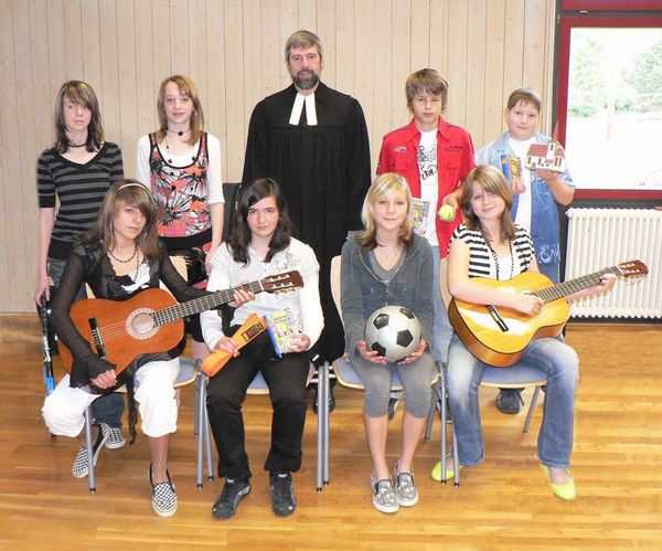 Im Rahmen des Gemeinde- und Kindergartenfestes an Christi Himmelfahrt wurden die neuen Konfirmanden und ihre Hobbies vorgestellt. Im nächsten Jahr werden sechs Mädchen und zwei Jungen konfirmiert. Das Bild zeigt von hinten (links): Luisa Schweikert, Jessica Vincon, Jan Mutschler und Marco Heinzelmann. Vorne (von links): Jana Bruscella, Julia Müller, Jasmin Bezner und Mariana Raible. Im Namen der Kirchengemeinde überreichte ihnen Simone Huß eine Bibel.