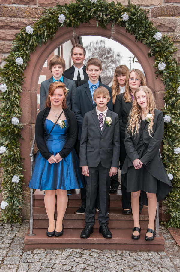 Konfirmiert wurden am Sonntag in der Hopfauer Katharinenkirche von Pfarrer Thomas Villwock (hintere Reihe von links gesehen: Fabian Breier, Manuel Schweikert, Lena Kitzlinger und Vanessa Kolczynski. (Vordere Reihe von links): Nathalie Bodmer, Magnus Pfendtner und Vivienne Siegel. Der festliche Gottesdienst wurde vom Posaunenchor Hopfau/Dürrenmettstetten und vom „Rainbow-Chor“ musikalisch umrahmt. Im Namen der Kirchengemeinde und des Kirchengemeinderates gratulierte Laienvorsitzender Tobias Klautke. Mit einer Fabel erinnerte er daran, dass wir alle Werkzeuge Gottes sind. Um das ganze etwas anschaulicher zu machen, hatte er den Konfirmanden kleine Hämmerchen und Schraubenzieher als Geschenk mitgebracht. Gleichzeitig lud er sie dazu ein, sich nach ihrer Konfirmandenzeit in der Gemeinde einzubringen, denn sie seien die Gemeinde von morgen. Ebenfalls mit einem Geschenk gratulierten Angelika Raible und Jutta Schirk vom „Rainbow-Chor“. Sichtlich gerührt zeigte sich Pfarrer Thomas Villwock, als ihm die Konfirmanden für die tolle Konfirmandenzeit einen Geschenkkorb überreichten. Nach dem Gottesdienst nahmen die Konfirmanden auf dem Kirchvorplatz die Glückwünsche entgegen
