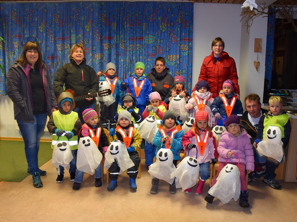 Laternenumzug. Fleißig wurden Laternen in Form von kleinen Gespenstern gebastelt. Die Kinder konnten es kaum mehr erwarten bis es endlich losging. Vor dem Kindergarten wartete bereits eine große Schar