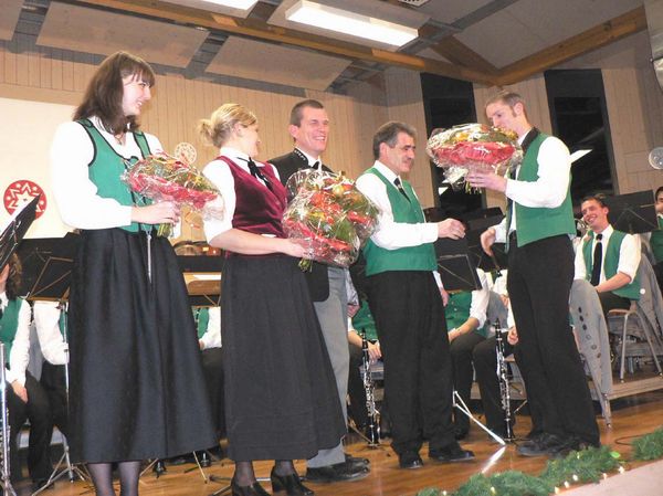 Vorsitzender Daniel Schrägle überreichte an die beiden Ansagerinnen und Dirigenten jeweils einen Blumenstrauß. Für seine