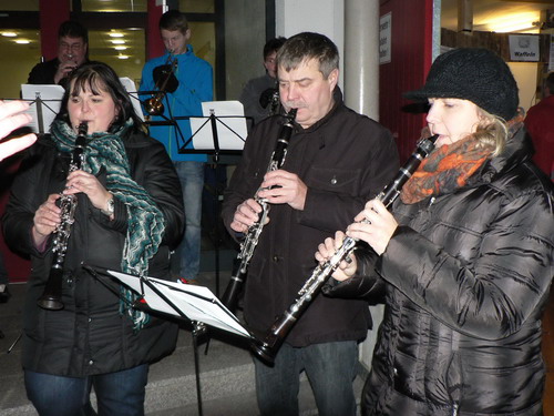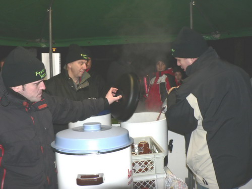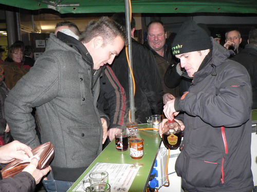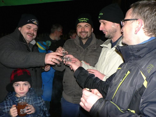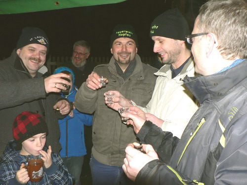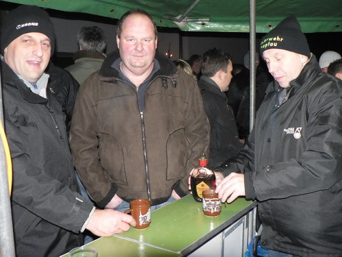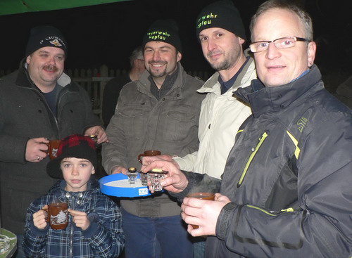 Einen ausgezeichneten Besuch konnte die Freiwillige Feuerwehr bei ihrer ersten Glühwein- und Punschparty vor dem Gerätehaus bei der Gemeindehalle verbuchen. Traditionell hatte die Feuerwehr in den vergangenen Jahren am Samstag vor dem 4. Advent nochmals eine Übung durchgeführt und anschließend intern ihre Weihnachtsfeier abgehalten. Angesichts der „Wünsche“ für das anstehende Jahr, aus eigener Kasse die Ausrüstung der Aktiven zu verbessern und auch dem Nachwuchs in der Jugendfeuerwehr etwas zu bieten zu können entschloss man sich, die Weihnachtsfeier öffentlich zu machen. Die Idee mit der Glühwein- und Punschparty entpuppte sich als voller Erfolg. Zu den Gästen zählten auch einige Feuerwehrkameraden aus dem Stadtgebiet. Vor dem Feuerwehr-Magazin herrschte ein richtiges Gedränge. An den aufgestellten Schweden-Feuern konnten sich die Besucher erwärmen. Für das leibliche Wohl war mit „heißen Roten“ und Waffeln gesorgt. Zur Einstimmung auf Weihnachten spielten einige Aktiven des Musikvereins auf und unterhielten die Gäste. Mit einem „Schwoba-Tequilla“ (einem Obstler, Schwarzwurst und Senf) stießen die Kommandanten Markus Pfundstein aus Lauterbach (links), Martin Schaible aus Hopfau (weiße Jacke), Volker Speidel aus Glatt (rechts) und Kassier Thomas Mutschler von der Hopfauer Wehr auf den geselligen Abend an.
