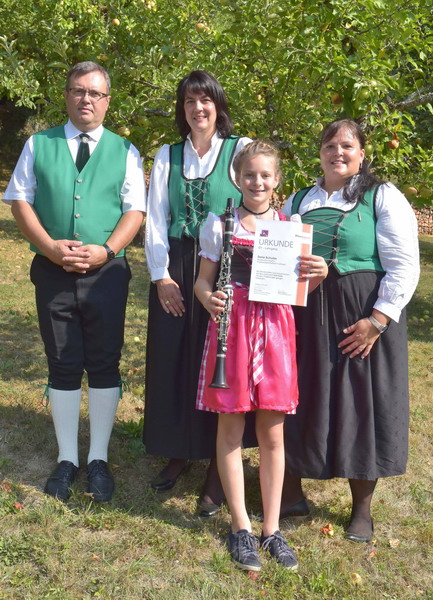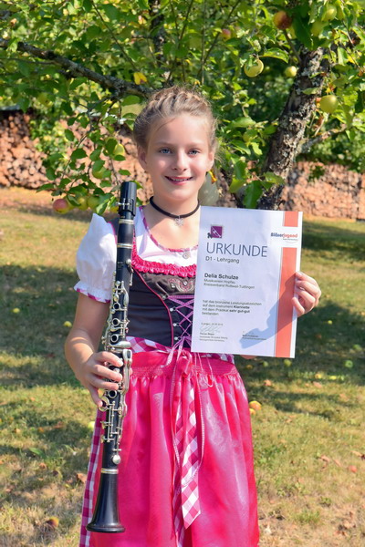 Sie hatte beim D1-Lehrgang in Grüntal bei Freudenstadt ihre theoretische Prüfung abgelegt und einige Wochen später mit ihrer Klarinette die praktische Prüfung bestanden. Insgesamt erhielt sie die Note „sehr gut – gut“ und durfte mit Freude das bronzene Leistungsabzeichen entgegennehmen. Über das tolle Abschneiden ihrer jungen Nachwuchsmusikerin freuten sich Ausbilder und Dirigent Ferenc Guti, die Vorsitzende Silke Weigold und Jugendleiterin Anke Obergruber ganz besonders. Delia Schulze setzte mit ihrem hervorragenden Ergebnis die äußerst erfolgreiche Jugendarbeit fort. Derzeit befinden sich 20 Kinder und Jugendliche in drei verschiedenen Gruppen beim Musikverein in der Ausbildung.