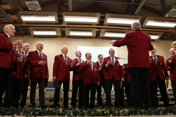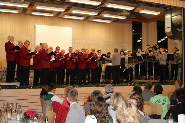Wössnerauf der Bühne ein, wo sie mit einem Gläschen Wein empfangen wurden. Der Männerchor verstand es, sein Repertoire eindrucksvoll zu präsentieren. Von Alpenromantik