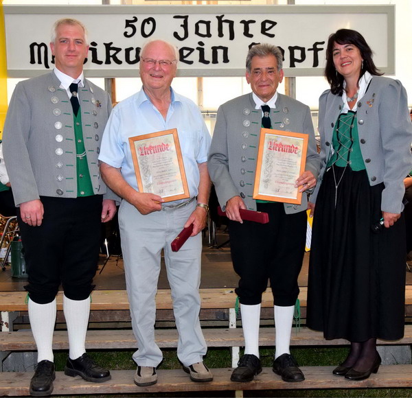 Sulz-Hopfau (dli). Eine ganz besondere Ehrung wurden Herbert Zeller und Lothar Grötzinger bei den Ehrungen des Musikvereins anlässlich des 50-jährigen Jubiläums zuteil. Beide wurden zu Ehren-Dirigenten ernannt. Herbert Zeller engagierte sich seit der Vereinsgründung im Jahre 1967 als Ausbilder der Musiker und als Dirigent. Im Jahre 1984 legte er aus familiären Gründen den Taktstock nieder. Als vor zehn Jahren beim 40-jährigen Jubiläum die Idee entstand, die Gründungskapelle wieder aufleben zu lassen, war er sofort wieder mit von der Partie. Seit zehn Jahren steht er als Dirigent der Hobbymusiker (Oldies) wieder ganz vorne. „Eigengewächs“ Lothar Grötzinger hatte 1984 den Dirigentenstab von Herbert Zeller übernommen und den Musikverein bis Ende 2012 dirigiert. Als der Verein Ende des vergangenen Jahres wieder auf der Suche nach einem Dirigenten war, habe er ohne zu zögern seine Bereitschaft signalisiert, den Verein wieder zu übernehmen bis ein Nachfolger gefunden wird, lobte die Vorsitzende Silke Weigold. Auch die Jahre dazwischen habe Grötzinger den Verein bei der Ausbildung der Jugendlichen und der Jugendkapelle unterstützt, hob die Vorsitzende hervor. Für das jahrzehntelange Engagement, die Zeit, die Ausdauer und die Nerven bedankte sich Silke Weigold ganz herzlich. Um dem Dank Ausdruck zu verleihen, wurden beide in Würdigung ihrer langjährigen Verdienste zu Ehren-Dirigenten ernannt. Bei der Verlesung der Ehren-Urkunde erhoben sich die Musiker von ihren Plätzen und spielten anschließend unter der Leitung von Daniel Schrägle den Marsch „Mein Regiment“. Neben den Urkunden überreichte Silke Weigold als Geschenk zudem einen edlen Taktstock.