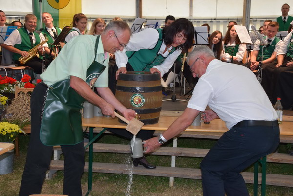 von 500 Euro aus dem Ortsbudget zu. Problemlos verlief der Fassanstich durch Bürgermeister Gerd Hieber. Nach vier zielsicheren Schlägen floss der Gerstensaft. Danach war die Bühne frei für die Blaskapelle