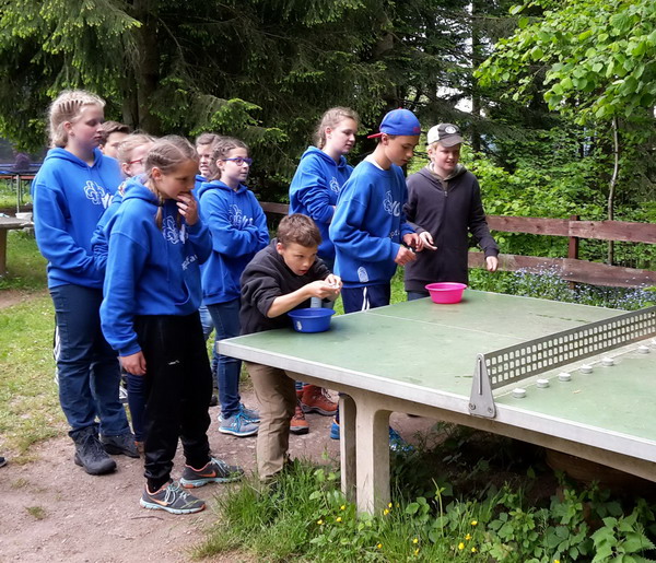 (Bild). Außerdem bereitete eine selbst gebaute Schaukel großes Vergnügen. Höhepunkt des Tages war das Nachtgeländespiel„Capture the Knicklichtball“. In dem großen Waldgebiet wurde die Aufgabe