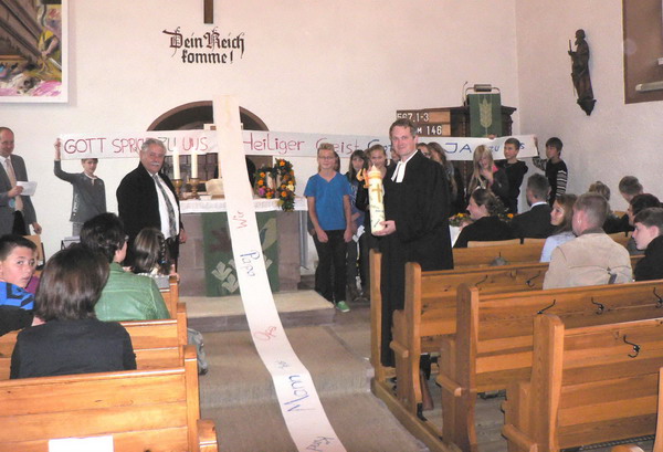 Pfarrer Thomas Buchner. Sie rollten hinter dem Altar und den ganzen Gang lang ein Papierband aus, das symbolisch von Jesus am Kreuz bis zu allen Menschen hin reichte. Hinter