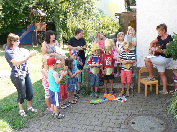 In den letzten Tagen standen im evangelischen Kindergarten noch allerhand Unternehmungen auf dem Programm. Als Abschlussthema hatten sich die drei Vorschüler das Thema Ritter und das Leben auf der Ritterburg gewünscht. Intensiv hatten sich deshalb die Erzieherinnenund ihre Schützlinge in den vergangenen Wochen mit dem Thema beschäftigt. Im Glatter Museum wurde den Rittern ein Besuch abgestattet. Die „Großen“ durften im Kindergarten übernachten und zuvor auf der Ruine „Lichtenfels“ auf Schatzsuche gehen. Abkühlung verschaffte bei den hochsommerlichen Temperaturen ein Tag im Schwimmbad. Absoluter Höhepunkt war der Familienausflug mit allen Kindergartenkindern und ihren Eltern sowie Geschwistern ins „Traumland“ bei der Bärenhöhle. Kindergartenleiterin Monika Ziegler begrüßte die große Schar an Eltern und Großeltern zum „Rausschmiss“ aus dem Kindergarten. In einem Lied besangen sie, was ein guter Ritter so alles braucht. Pfarrer Wolfgang Müller bedankte sich von der Trägerseite des evangelischen Kindergartens bei den Erzieherinnen und wünschte den drei Schulanfängern einen guten Start. Dies bedeute für die Eltern und die Kinder einen neuen Abschnitt. Sein Dank galt auch dem Elternbeirat und den Eltern für die gute Zusammenarbeit. Besonders hob er dabei den Frühlingsmarkt hervor, wo sich sehr viele beteiligten. Mit dem Erlös der Veranstaltung können neue Spielgeräte angeschafft und der Erhalt des Kindergartens in kirchlicher Trägerschaft unterstützt werden. Mit der Organisation eines Marionetten-Theaters hatte sich die IG Kindergarten für den Kindergarten stark gemacht. Ganz erfreulich sei, dass die Kindergartenarbeit auf Grund eines höheren Zuschusses vom Kirchenbezirk zukünftig auf finanziell gesündere Füße gestellt werden könne. Mit dem kleinen und familiären Kindergarten sowie den engagierten Erzieherinnen könne man sehr zufrieden sein, was im vergangenen Jahr alles so passiert sei, lobte Pfarrer Müller. Vor dem Rauswurf wurde noch das Lied „Ja so warn’s, die alten Rittersleut‘“ etwas umgedichtet und vorgetragen. Danach kam der große Rauswurf. Die angehenden Schulanfänger wurden einzelnen mit den Worten „ .... wird gerüttelt und geschüttelt zum Kindergarten hinaus“ symbolisch die Treppe vom Kindergarten „hinab geworfen“. Mit einem riesen Satz sprangen sie die Treppenstufen hinunter. Die jüngeren Kinderschüler standen dabei Spalier. Die Erzieherinnen überreichten jedem Kind eine Ritter-Schultüte und ihre Mappe mit den gesammelten Werken aus den vergangenen drei Jahren. In der Schultüte befand sich auch ein Gutschein über einen Besuch im Kindergarten. Mit einer Sonnenblume und einem Bild verabschiedeten sich die drei Vorschüler von ihren Erzieherinnen. Zudem hatten die drei Vorschüler mit der Hilfe von Maltes Vater Thomas Fröhlich zum Abschied und als Erinnerung einen Tisch als Geschenk für den Kindergarten gebastelt. Anschließend luden die Erzieherinnen bei den hochsommerlichen Temperaturen Jung und Alt zu einem erfrischenden Getränk ein. Nach den Sommerferien startet der Kindergarten mit 14 Kindern in das nächste Kindergartenjahr. Im Laufe des Herbstes kommen nach und nach noch einige Kinder hinzu.