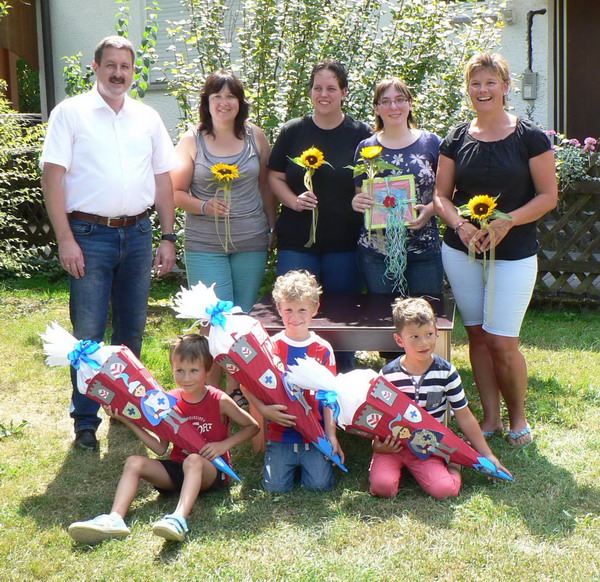 kleinen Feier aus dem Kindergarten „geworfen“. Der Abschied von ihren drei Schützlingen fiel den Erzieherinnen nicht leicht. Vor dem Kindergarten warteten bereits die Eltern, Omas und Opas mit Kameras auf ihre Sprösslinge.