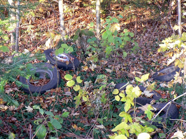 Ortsteil „Dobel“ hinter dem Gewann „Ofen“ auf der Sulzer Höhe. Gegenüber von seiner Güllegrube stellte er fest, dass wohl neuerdings nicht nur das Herbstlaub von den Bäumen fällt, sondern auch Reifen. In seinem Waldstück