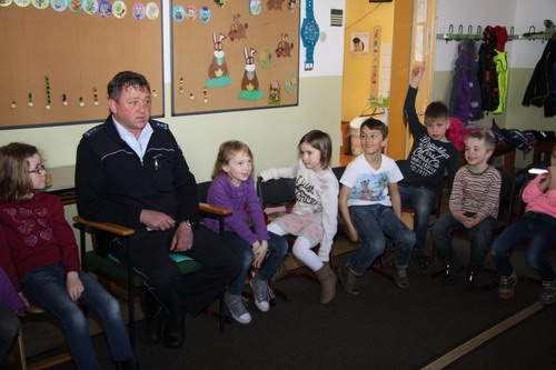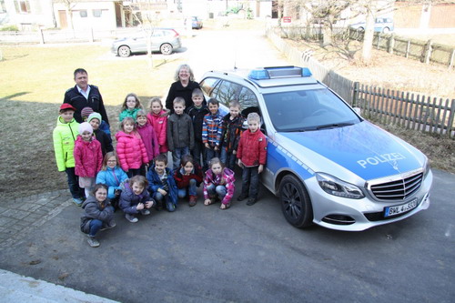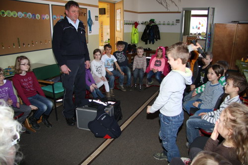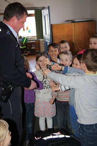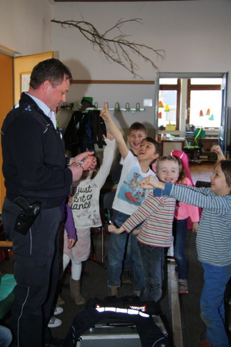 Großen Spaß machte es natürlich auch, einmal das Rathaus bei einer Besichtigungzuerkunden. Wie viele Vereine im Ort vertreten sind, wissen die Jungs und Mädchen nun auch. Ganz schön aufregend war aber der Besuch von Leons Papa, Polizeihauptmeister Frank Effinger vom Polizeiposten in Dornstetten, der im Dienstwagen vorfuhr. Ihn konnten sie nach Herzenslust mit Fragen löchern, wobei neben dem Schlagstock die Handschellen das Interessanteste war und die sich alle mal kurz anlegenließen. Frank Effinger berichtete von seinem Tagesablauf, der von Einbrüchen, Drogendelikte und Körperverletzungen handelt. Am Ende des Tages warte natürlich die „leidige Schreibtischarbeit“ auf ihn, erklärte er den wissbegierigen Schülern.