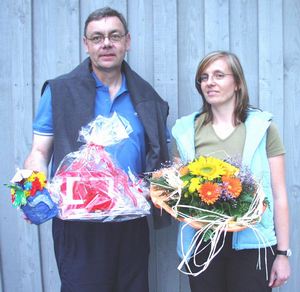 Schulleiter Karl Stephan und Ramona Aschenbrenner für ihre geleistete Arbeit. Als Dankeschön überreichte sie jeweils einen Gutschein für ein Buch. Mit einer aus Salzteig gefertigten Blumenvase und einem Sträußchen bunter Blumen