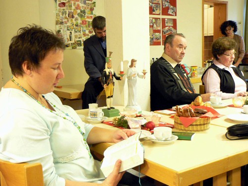 Pfarrer Christoph Knoke freute sich, dass so viele der Einladung gefolgt waren. Nur wenige Plätze in dem wunderschön adventlich dekorierten Saal blieben noch frei. Wie auch in den vergangenen Jahren lud der Posaunenchor aus Hopfau/Dürrenmettstetten unter der Leitung von Hans Steinwand aus Dürrenmettstetten zu einem Wunschkonzert ein. Gewünscht wurden vornehmlich bekannte Kirchenlieder sowie Stücke zur Advents- und Weihnachtszeit. Kräftig sangen die Besucher aus den ausgelegten Gesangbüchern mit. Mit Beifall und dem Dank von Pfarrer Christoph Knoke wurden die Bläser verabschiedet. Hans Steinwand bedankte sich für das Mitsingen und wünschte allen eine frohe Advents- und gesegnete Weihnachtszeit. Gerne hatte auch Ortsvorsteherin Daniela Wittig die Einladung zu dem gemütlichen Nachmittag im Pfarrhaus angenommen. Sie erzählte wie die Menschen aus ihrer Heimat, dem Erzgebirge, die Adventszeit und Weihnachten feiern. Als Symbole für die Tradition hatte sie einen geschnitzten Engel und einen Bergmann mitgebracht. Zudem hatte sie mehrere leckere Christstollen nach einem alten Rezept aus ihrer Heimat für die Senioren gebacken. Zur Unterhaltung trug sie die Weihnachtslegende „Das Christkind bei den Bergleuten“ vor. Passend zur Jahreszeit stellte Pfarrer Knoke die Bedeutung der Adventszeit heraus. Nach einem Lied und einem Gebet wurde zu Kaffee und Tee mit Christstollen, Hefezopf, Schokoladelebkuchen und Butter-Laugenstangen eingeladen. Das persönliche Gespräch untereinander kam dabei nicht zu kurz. Danach wurde zu einem „Viertele“ und sonstigen Getränken eingeladen. An einem Büchertisch konnten christliche Literatur, Bibeln und Kalender für 2008 erworben werden. In den späten Nachmittagsstunden klang die Veranstaltung aus.