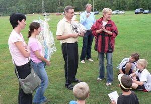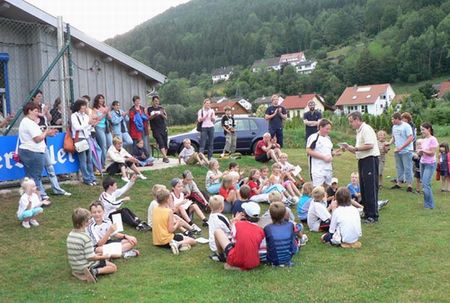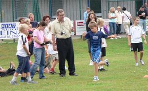 eine Wurst. Um das Warten bis zur Siegerehrung zu verkürzen, wurden den Übungsleiterinnen des Kinderturnens einige heitere Spiele auf dem Sportplatz angeboten. Mit Spannung warteten die Kinder auf die Siegerehrung.