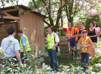 Das Bild zeigt von links Heimleiter Hanno Schönthal von der Drogenhilfe Tübingen, „Ober-Kritiker“ Frieder Steibmüller und Moderator Thomas Scholz sowie ein Teil des Bauteams in den roten Westen, Organisator Andreas Höhn und Ortsvorsteherin Daniela Wittig.