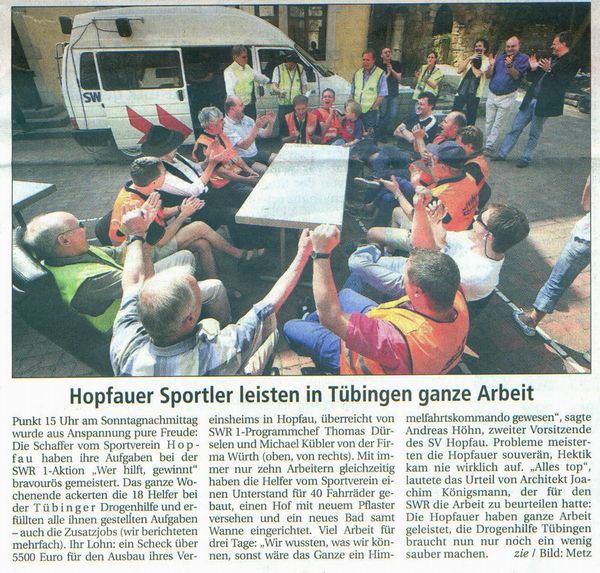 Mit Bravour bewältigte der Sportverein seine Aufgaben bei der SWR 1-Aktion „Wer hilft, gewinnt“ auf der Baustelle der Drogenhilfe in Tübingen. Unter großen Jubel der Helfer und mitgereisten Zuschauer durfte Andreas Höhn als 2. Vorsitzender und Organisator des Arbeitseinsatzes den Scheck über 5500 Euro in Empfang nehmen.