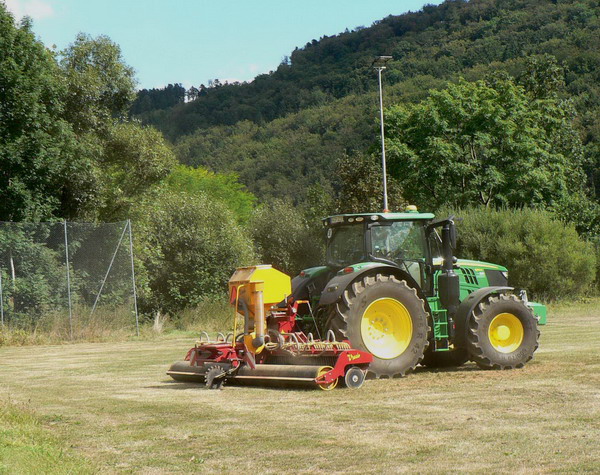 eingesĂ€t werden. Probleme bereitete dabei jedoch die lange anhaltende Trockenheit. Damit der Rasensamen mit der SĂ€maschine ĂŒberhaupt ein bis zwei Zentimeter tief in den Boden eingebracht werden