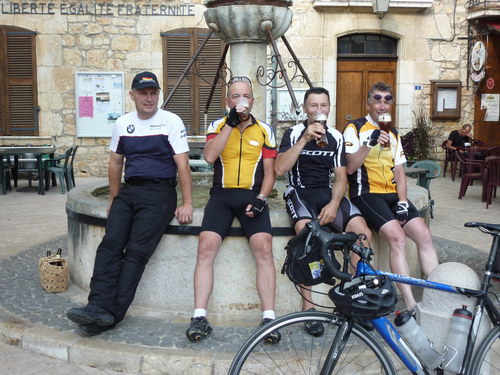 Canyon du Verdon. Im nächsten Tagesziel, dem Ort Ampus wurden die drei Radler von der örtlichen Presse und der Frau von Thomas Späth herzlich mit einem Alpirsbacher Weizenbier empfangen.Thomas Späth und seine Frau