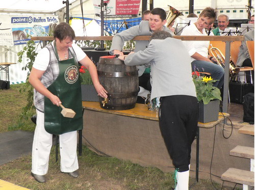 Der Abend begann mit dem Fassanstich durch Ortsvorsteherin Daniela Wittig, der ohne einen Tropfen zu vergeuden, mit treffsicheren Schlägen ausgeführt wurde. Anschließend spielte die Tanzband „ Ultraschall“ im gutgefüllten Festzelt zur Unterhaltung und zum Tanz auf.