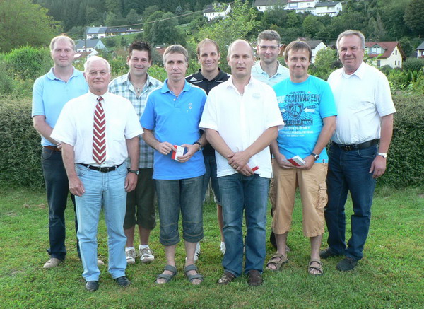 Das Bild zeigt (von links gesehen) den Vorsitzenden Helmut Link, den Sportkreis-Vorsitzenden Robert Nübel, Thomas Obergruber, Gerd Springmann, Thomas Guhl, Andreas Höhn, Alexander Späth, Axel Weigold und Edgar Pakai als Vorsitzender vom Fußballbezirk Nördlicher Schwarzwald.
