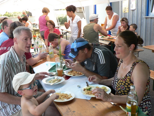Für die Sportler war die Hitze sicherlich kein Zuckerschlecken, dafür freuten sich die Gäste in den Abend- und Nachstunden umso mehr. Am Freitag wurde zur „Oberbayern-Party“ beim Sportheim eingeladen. Dabei wurde in Anlehnung an die Partymeile von Mallorca einfach „Malle“ mit seiner fetzigen Musik nach Hopfau geholt, so der Vorsitzende Helmut Link bei der Begrüßung der Gäste. Bei der Hitze gingen jedoch nur wenige Maß Bier über die Theke. Mehr Anklang fanden dagegen die kleinen Eimerchen mit Sangria und Früchten. Mehrere Personen saßen dabei mit Trinkhalmen um das Getränk herum und machten sich ihren Spaß. Sehr gut war am Samstag die bereits traditionelle „Italienische Nacht“ besucht. Angeboten wurden verschiedene Nudelgerichte und ein Antipasta-Teller als Vorspeise oder zum Wein. Calamares rundeten die kulinarischen Leckerbissen ab. Bis spät in die Nacht hinein genossen die Gäste das herrliche Sommerwetter. Einen ebenfalls sehr guten Besuch konnte am Sonntag zum Mittagessen mit Rahm- und Schweinehalsbraten verbucht werden. Zum Elfmeterturnier hatten sich insgesamt zehn Mannschaften angemeldet. Dabei stand der Spaß im Vordergrund. In zwei Gruppen ermittelten sie die Teilnehmer für das Viertel- und Halbfinale. Im Finale besiegten schließlich die „Thekenschlampen“ die Mannschaft von „Fußlahm“ knapp mit 4:3. Gleich im Anschluss an das Endspiel bat Vorsitzender Helmut Link zur Siegerehrung. Er bedankte sich bei den Mannschaften, dass sie sich an dem Spaß beteiligt hatten. Startgeld wurde keines erhoben. Bis zum 3. Platz wurden Verzehrgutscheine ausgegeben. Die Endplatzierungen: 1. Thekenschlampen, 2. Fußlahm, 3. Pommes Fritz mit Soße, 4. Das Huhn, 5. Ausschussware, 6. Die Vier lustigen Drei, 7. Feuerwehr, 8. „Fünf-trifft nix – einer hält nix“, 9. Kamillejäger, 10. Pokalsieger. In einem Einlagespiel standen sich die F-Jugend-Spieler und ihre Mütter gegenüber. Dabei gewann die Mütter gegen ihre Sprösslinge knapp mit 2:1 Toren. Als das Unwetter mit Hagel einsetzte hatte sich der Großteil der Gäste bereits ins Sportheim zurückgezogen und das Finale der Europameisterschaft der Frauen verfolgt.