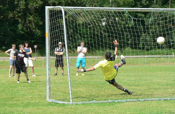 Beim Elfmeterschießen ließ Rebecca Horr als 2. Vorsitzende des Sportvereins vom Team „Ausschussware“ Torhüter Jürgen Schäfer von "Fünf-trifft nix – einer hält nix“ keine Chance. Geschickt hatte sie den erfahrenen Keeper „verladen“ und den Ball mitten ins Tor geschossen.