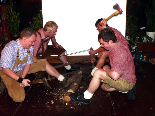 Abends zwar der Auftritt der „Lustigen Holzhacker-Buam“ mit ihrem astrein einstudierten Schuhplattler. Angesichts der stürmisch geforderten Zugabe war ihr Auftritt eine schweißtreibende Angelegenheit. Mit Axt und Säge