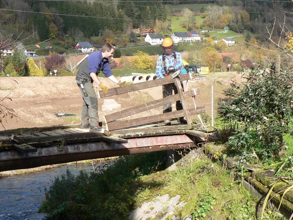 Ortsvorsteher Albert Beck und der Ortschaftsrat hatten bei der Feuerwehr angefragt, ob sie die Brücke abbauen könnten. Sie wurde in den 1990er-Jahren auf Wunsch der Einwohnerschaft gebaut. Angedacht war, vom „Hotel an der Glatt“ am Ufer der Glatt entlang zu flanieren. Aus sicherheitstechnischen Gründen durfte der Übergang an der Einmündung in die Glatt nicht mehr benutzt werden. Ein Absperrband an beiden Seiten hinderte am Überqueren. Das Holz der Brücke war teilweise total morsch. Die Witterung hatte über die Jahre hinweg ganze Arbeit geleistet. Das Betreten war deshalb gefährlich und es musste mit größter Vorsicht zu Werke gegangen werden. Mit einer Motorsäge wurden zuerst das Geländer und anschließend die Dielen vom Boden entfernt. Als Träger der Brücke dienten zwei Holzstämme. Sie wurden durchtrennt und mit Hilfe eines Traktors sowie eines Unimogs „an Land“ gezogen und zersägt. Aus Hochwasserschutzgründen mussten im Bereich der „Glatt“ unterhalb der Glatttalbrücke links vom Flusslauf massive Vorlandabgrabungen gemacht werden. Da das „Naherholungsgebiet“ deshalb mehr auf die andere Seite der „Glatt“ verlegt wird, ist keine Ersatzbeschaffung für die Brücke vorgesehen.