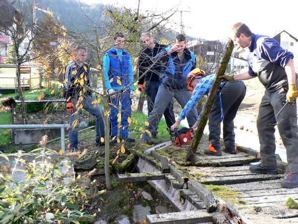 Im Rahmen eines Arbeitsdienstes baute die Freiwillige Feuerwehr die marode Brücke über den Dobelbach beim Haus Kinzler ab. Nach zwei Stunden hatten die acht Floriansjünger die Arbeit erledigt und die Überreste entsorgt.