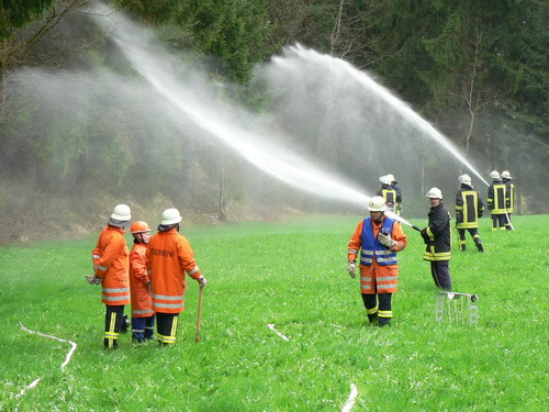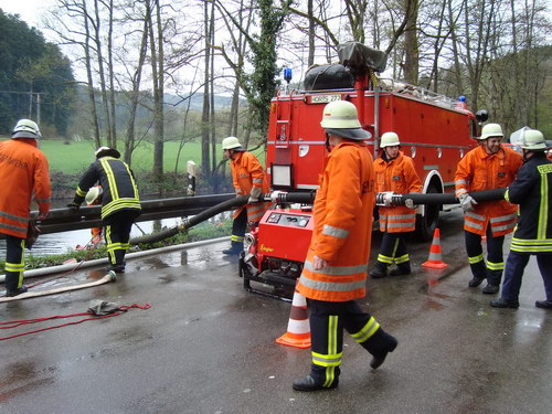 Leitungsaufbau und der beschwerliche Transport der Pumpe wurde nur theoretisch durchgespielt. Als die Kameraden aus Sulz eintrafen, wurde eine zweite Pumpe zur Wasserentnahme aus der Glatt in Stellung gebracht. Interessiert verfolgten die
