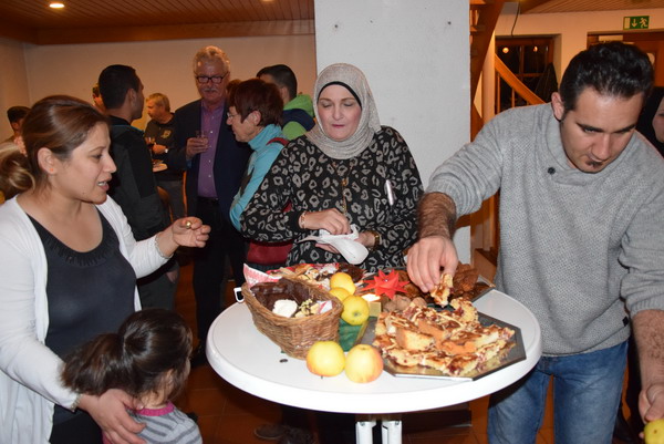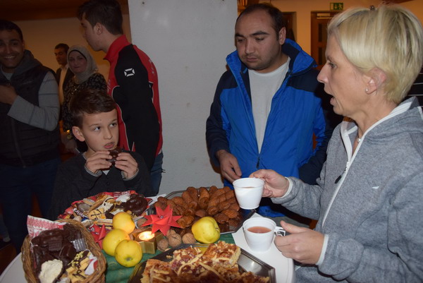 Sprache übersetzt. Die ehrenamtlichen Helfern und eine Flüchtlingsfamilie hatten traditionelles Weihnachtsgebäck mitgebracht und auf den Stehtischen verteilt. Zudem
