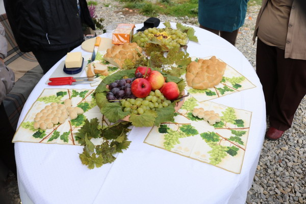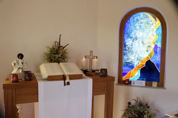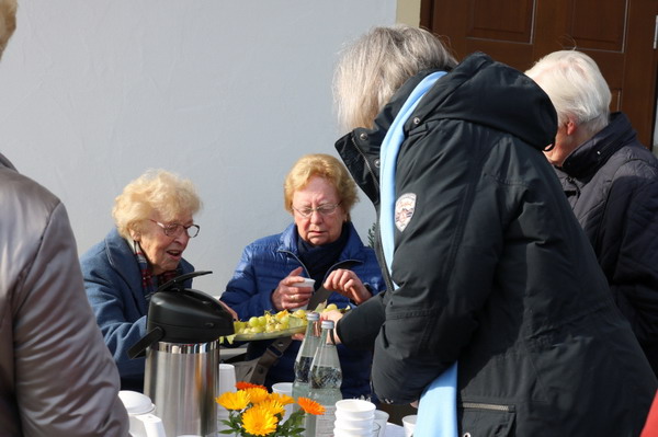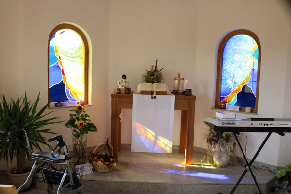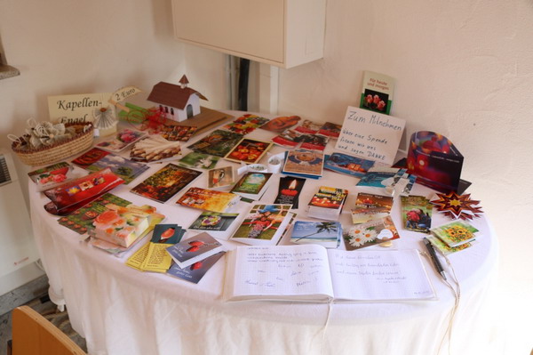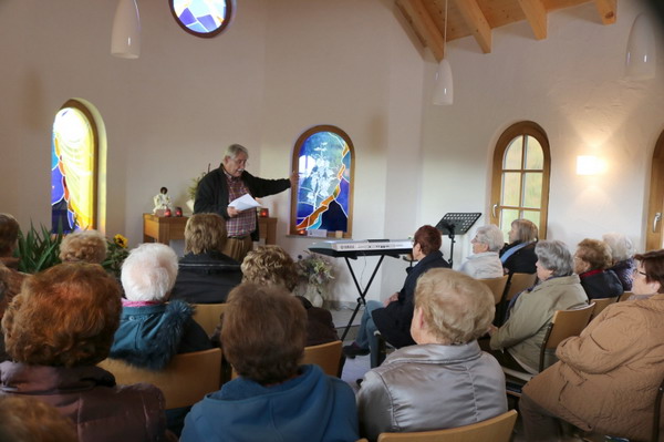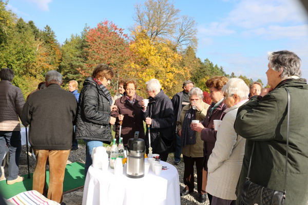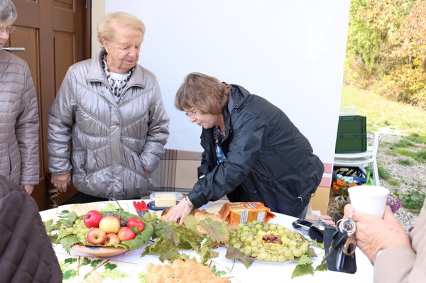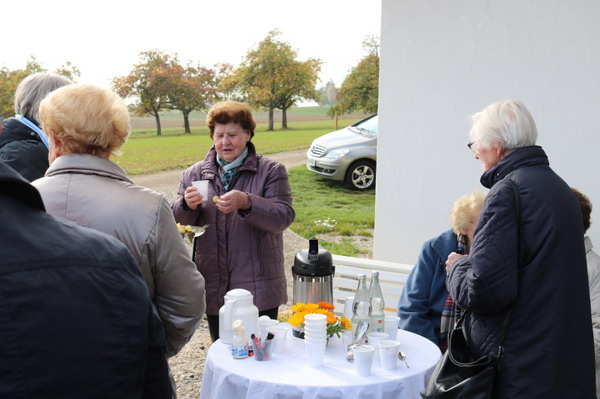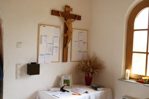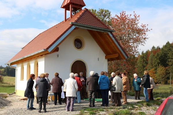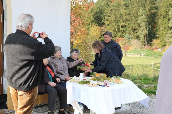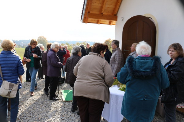 Dass die jederzeit offen stehende Kapelle von Wanderern, Radfahrern und auch Einheimischen gut frequentiert wird, davon zeugen die zahlreichen Eintragungen ins Gebetbuch und die angepinnten Gebetszettel in der ruhigen Gebetsecke, in der auch die Christusfigur am Kreuz aufgehĂ€ngt ist. Ein vielfĂ€ltiges Angebot an Karten mit herbstlichen und weihnachtlichen Motiven liegt auf einem anderen Tisch aus. Nach einem gemeinsam gesungenen Lied wurden die Senioren zum Abschluss vor der Kapelle mit selbstgebackenem âRebenâ aus Hefeteig, kleinen Snacks und GetrĂ€nken versorgt. Und zur Freude aller lieĂ Elfriede Buchner auch noch die Kapellen-Glocke erklingen.