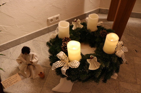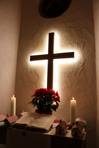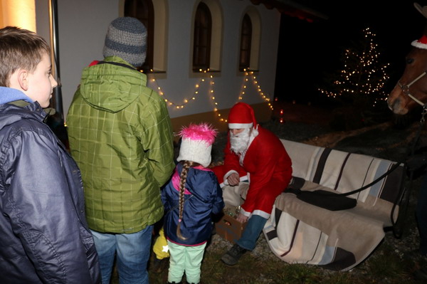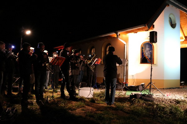 Der Posaunenchor Hopfau/Dürrenmettstetten umrahmte die kleine Adventsfeier mit mehreren musikalischen Stücken, Jung und Alt sang gemeinsam Weihnachtslieder und dann kam tatsächlich noch der Nikolaus mit seinem „Rentierpferd“ vorbei und hatte allerhand Süßigkeiten zu verschenken.Hans-Thomas Buchner lud anschließend die Gäste zum Verweilen bei Gebäck, Tee und Punsch ein. Weiterhin konnte die heimelig warme Kapelle von innen besichtigt werden, in der eine von Krippenbauer Ernst Jäkle gespendete Weihnachtskrippe aufgestellt war. Buchner dankte für die Aktion „Eine Münze pro Tag für die Kapelle“, die kapellenförmige Spardose konnte auf dem Altar abgestellt werden. Der Erlös des Adventsabends geht hälftig an die Christusträger Bruderschaft, die andere Hälfte wird für den Bau der Außenanlage der Kapelle verwendet.