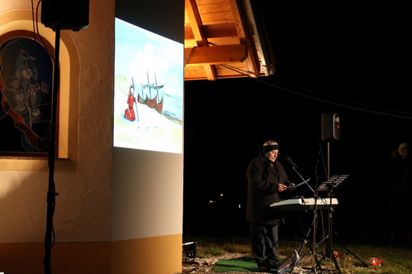 Besonders freute es den Vorsitzenden des Kapellenvereins, Pfarrer Hans-Thomas Buchner, dass man sich dieses Jahrrund um die Kapelle versammeln konnte, deren Einweihung für nächstes Jahr im Mai geplant ist. „Wenn man es vom Wetter auch nicht merkt, aber es ist Advent geworden“, begrüßte er die vielen Besucher aus Nah und Fern. Weil dieses Mal der zweite Advent auch der Nikolaustag war, nahm Pfarrer Buchneres zum Anlass, die Legende vom Bischof von Myra aufzuzeigen. Mit Bildern untermalt erzählte er die Geschichte des „Kornwunders von Myra“, in derder Bischof Nikolaus Gott um Hilfe anflehte, als eine große Hungersnot über sein Dorf hereinbrach.
