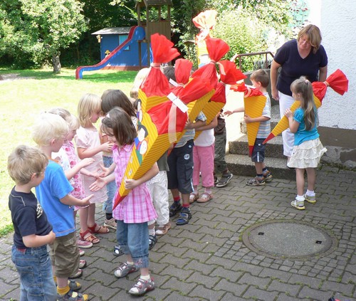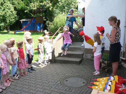 Traditionell wurden die kommenden Schulanfänger im Rahmen einer kleinen Abschiedsfeier „aus dem Kindergarten geworfen“. Verabschiedet wurden auf diese Weise acht Kinder.